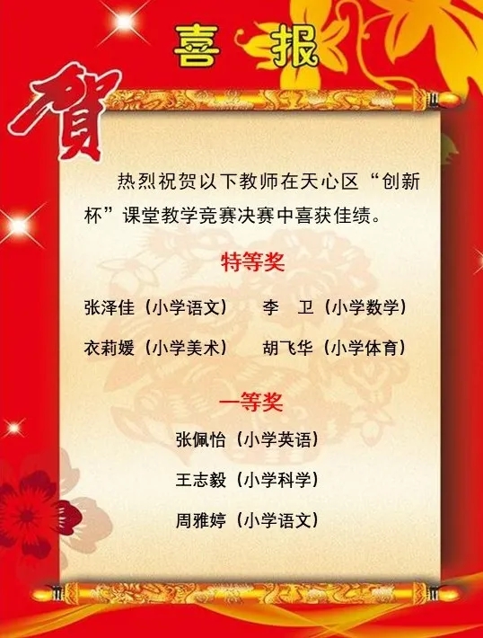 五月中旬,历时两个多月的天心区第五届“创新杯”教学竞赛圆满落下帷幕,经片赛、区赛层层选拔,公司一附小7名教师在天心区第五届“创新杯”教学竞赛中荣获4个特等奖、3个一等奖。其中校张泽佳、李卫、衣莉媛、胡飞华四位老师分别奖得语文、数学、美术、体育学科的特等奖;王志毅、周雅婷、张佩怡三位老师分别获得科学、语文、英语学科的一等奖。