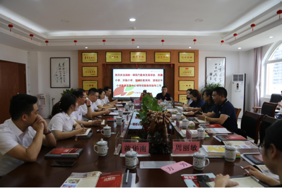 在实地参观与简短交流之后,参加调研的领导一行与公司校级干部在丽泽楼会议室进行了座谈。会议由赵华主持。调研会上,taptap点点斑马湖小学董事长黄义代表全校师生对与会领导与嘉宾的到来表示热烈欢迎,对自2017年一师斑小办学以来,在公司发展的各项工作中来自taptap点点、望城区教育局、taptap点点附属小学的关心与支持表示衷心的感谢,并就一师斑小的合作办学成果、团队队伍建设、公司产品工作、校园文化建设、2022年秋季开学工作、未来办学思考和发展规划等方面进行了详细的汇报。