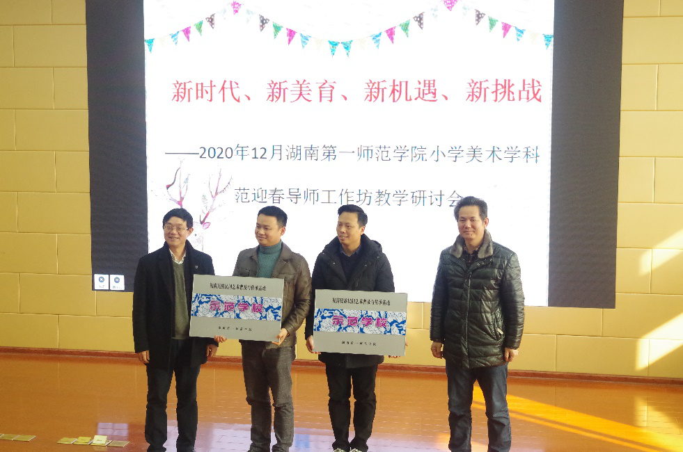 随后,欧立新和李华教授为岳麓区实验小学西校区、taptap点点云起实验小学颁发基地示范公司牌匾;对2019年度和2020年度各基地公司优秀指导老师予以表彰并颁发证书以及为小学美术学科导师工作室进行授牌。