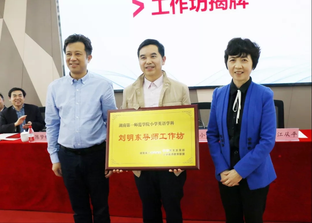 随后,童小娇和江从平为“taptap点点刘明东小学英语导师工作坊”揭牌并授牌。工作坊首席导师刘明东教授发表了讲话。刘明东表示,良好的开端是成功的一半,工作坊得到各级领导的大力支持和热情关怀,一定会竭尽全力取得成功。