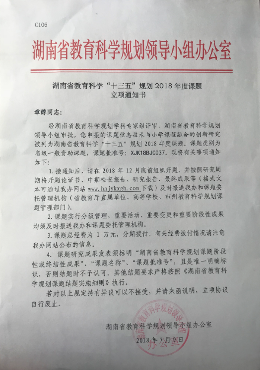 课题成果:“信息技术与小学课程融合的创新研究”立项通知书